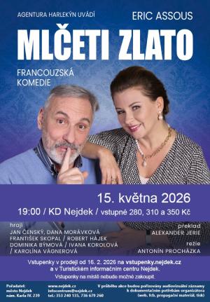 Město Nejdek Vás zve na divadelní představení MLČETI ZLATO dne 15. května 2026 od 19 hodin v Kulturním domě Nejdek.