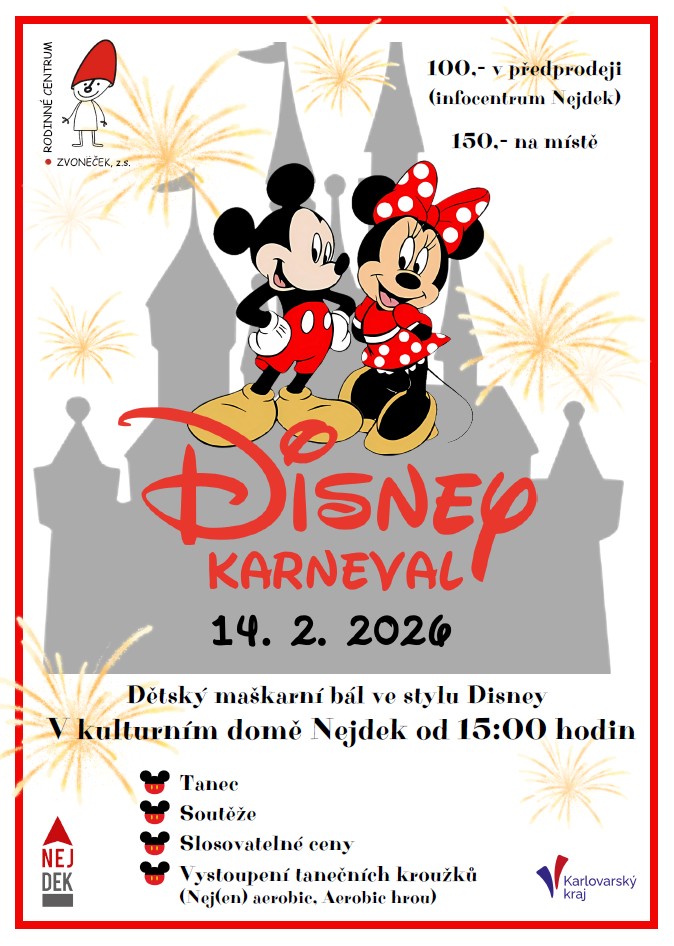 Dětský maškarní bál ve stylu Disney V kulturním domě Nejdek dne 14. 2. 2026 od 15:00 hodin. Vstupné 100,- v předprodeji