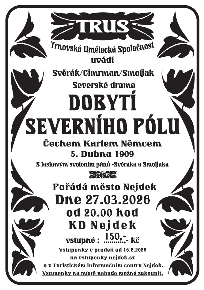Vstupenky v prodeji od 16. 2. 2026 od 8 hodin on-line a v Turistickém informačním centru Nejdek.