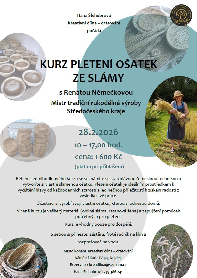 Během sedmihodinového kurzu se seznámíte se starodávnou řemeslnou technikou a vytvoříte si vlastní slaměnou ošatku. Pletení ošatek je ideálním prostředkem k vyčištění hlavy od každodenních starostí a jedinečnou příležitostí k získání radosti z výsledku své práce.
