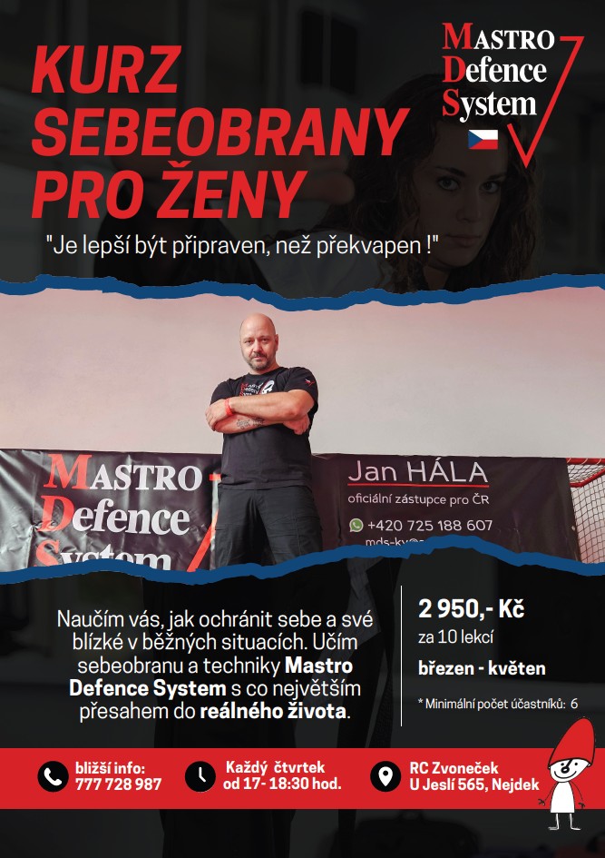 KURZ SEBEOBRANY PRO ŽENY. Naučí vás, jak ochránit sebe a své blízké v běžných situacích. Cena za 10 lekcí (březen-květen) 2 950 Kč. Každý čtvrtek od 17:00-18:30 hod. Bližší info na tel. č. 777 728 987.