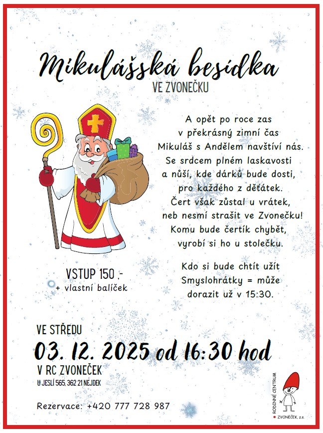 Mikulášská besídka v RC zvonečku ve středu 3. 12. 2025 od 16:30 hod. Vstup Kč 150 + vlastní balíček. Rezervace: +420 777 728 987.