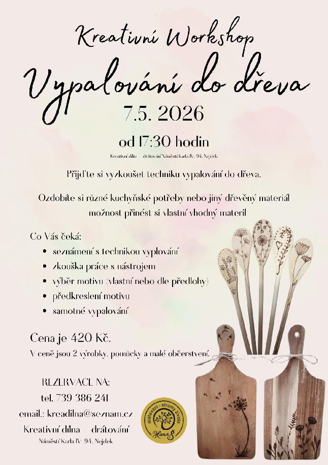 Hana Šlehubrová Kreativní dílna – drátování pořádá KURZ VYPALOVÁNÍ DO DŘEVA. Přijďte si vyzkoušet techniku vypalování do dřeva.