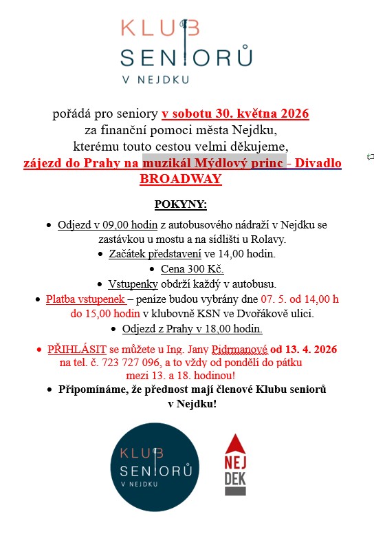 KLUB SENIORŮ V NEJDKU pořádá pro seniory v sobotu 30. května 2026 za finanční pomoci města Nejdku, kterému touto cestou velmi děkuje, zájezd do Prahy na muzikál Mýdlový princ - Divadlo BROADWAY.