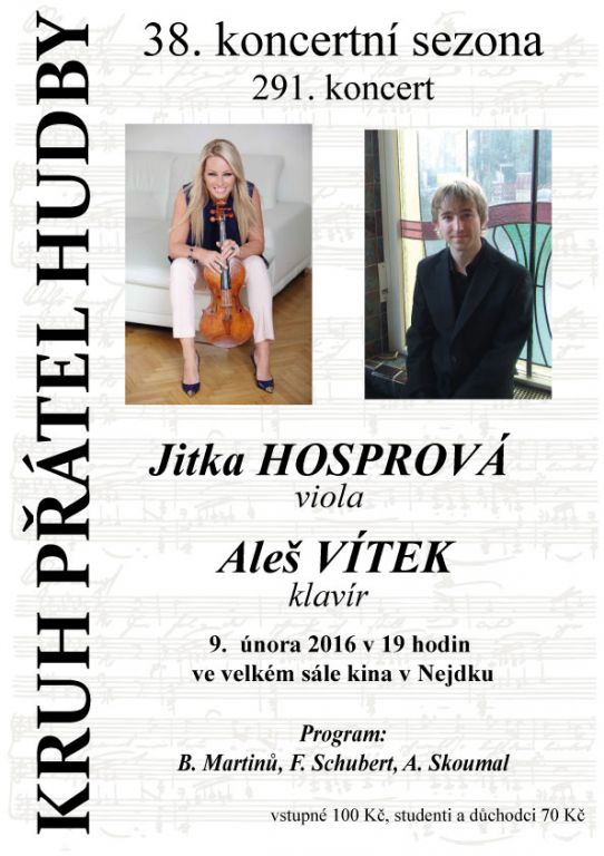 V úterý 9. února se uskutečnil další ze série koncertů konaných v rámci 38. koncertní sezóny připravené Kruhem přátel hudby v Nejdku. Ve večerním programu vystoupila violistka Jitka Hosprová s klavírním doprovodem Aleše Vítka.